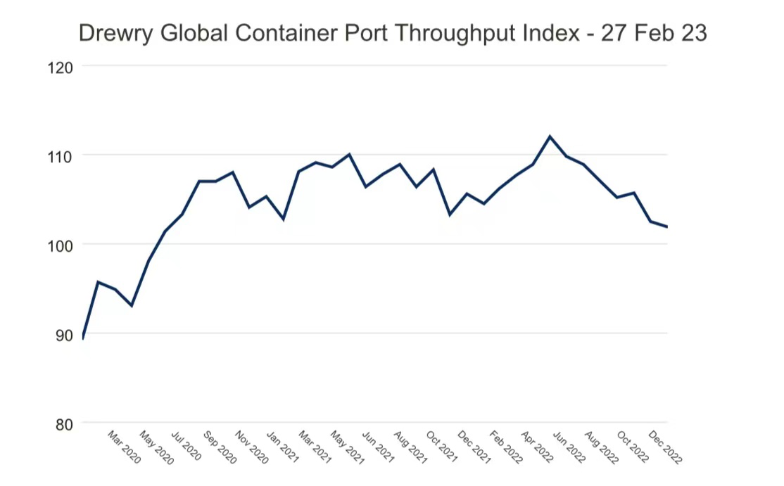 The Drewry North American Port Throughput Index declined 6.6% MoM/11.4% YoY to 95.5 points in December 2022. All major West Coast ports posted a YoY decrease in December. After witnessing an 8.8% decline in November, Oakland traffic dropped 12% MoM in December 2022, while throughput at Vancouver, which was struggling with winter weather delays, declined 24.9% MoM.