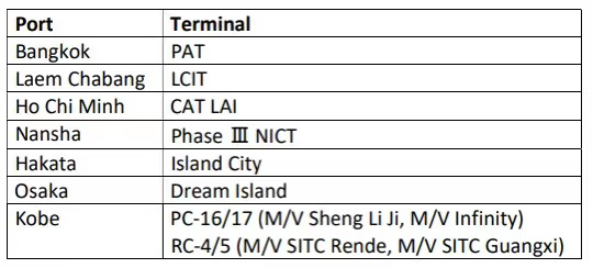 Bangkok (Thailand) - Laem Chabang (Thailand) - Ho Chi Minh (Vietnam) - Nansha (China) - Hakata (Japan) - Osaka (Japan) - Kobe (Japan)