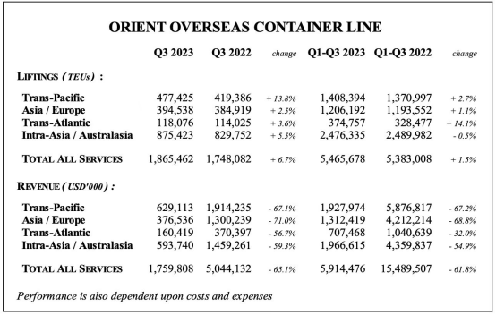 Orient Overseas Container Line's (OOCL's) total revenues declined by 65% in the third quarter of the year to US$1.76 billion, while the carrier's total liftings grew by 6.7% to 1.86 million TEUs.